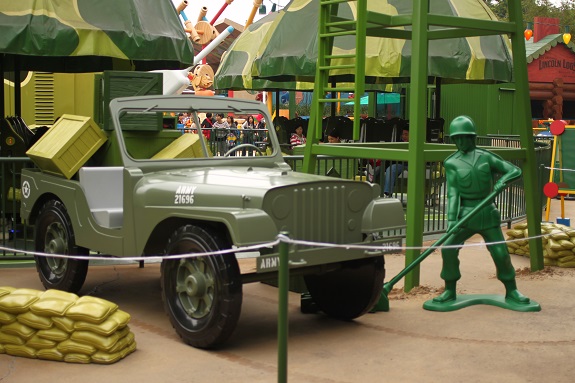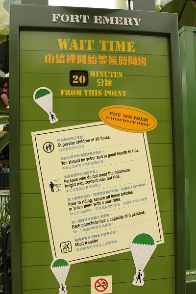 As with everything in Hong Kong’s Toy Story Land, they’ve done a great job at keeping the theme for each ride. While waiting for your parachute training you’ll see loads of life sized toy soldiers, jeeps, and equipment. If you keep your eyes up you might even see a hidden Mickey among the storage crates.